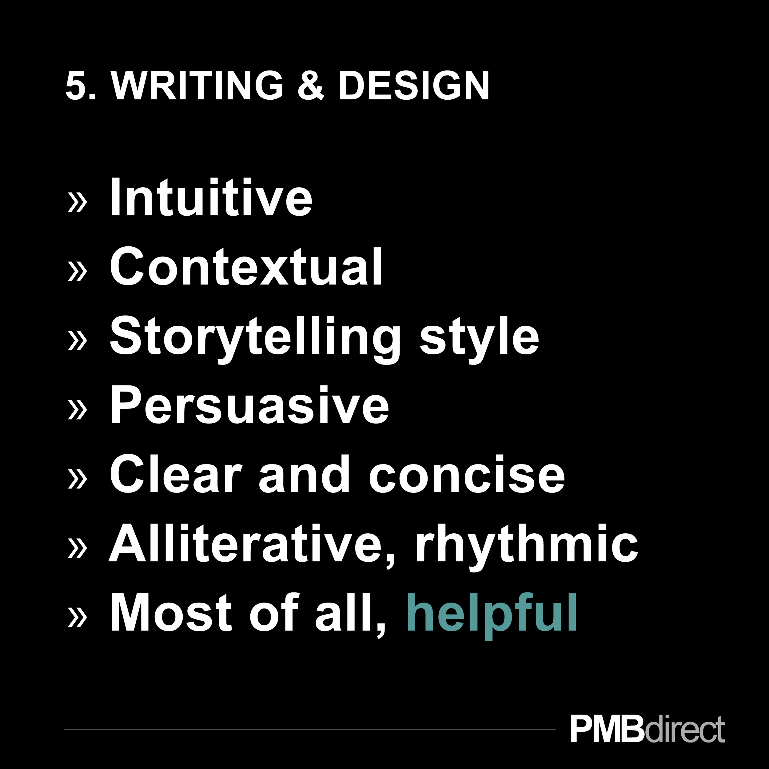 Clustering: People have a limited amount of space in their short-term memory. So, when you’re creating content, keep clustering in mind. How can you design and lay out your content to increase memory retention? Numbered bullet points, different header sizes … make it easier to scan, remember, and recall.